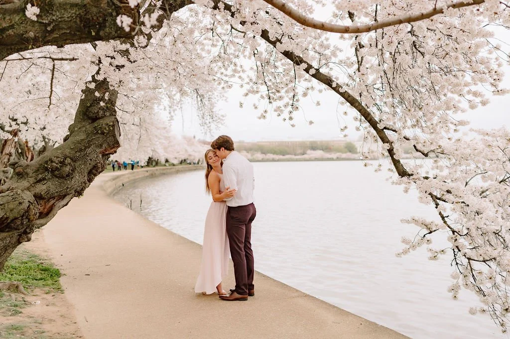 Washington DC transforms into a magical location during the cherry blossom season! Sydney and Camden chose this enchanting setting for their spring engagement session. Sydney had a vision for their engagement session. She wanted the fairytale look of the cherry blossoms combined with the richness of Washington DC. The cherry blooms created a dreamlike canopy that framed the photos. This made for a stunning backdrop! The dreamy cherry blossoms created the perfect frame for the photo session.